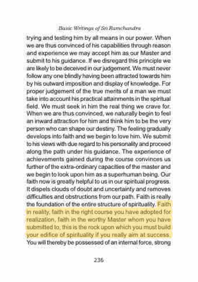 trying and testing him by all means in our power. When we are thus convinced of his capabilities through reason and experience we may accept him as our Master and submit to his guidance. If we disregard this principle we are likely to be deceived in our judgement. We must never follow any one blindly having been attracted towards him by his outward imposition and display of knowledge. For proper judgement of the true merits of a man we must take into account his practical attainments in the spiritual field. We must seek in him the real thing we crave for. When we are thus convinced, we naturally begin to feel an inward attraction for him and think him to be the very person who can shape our destiny. The feeling gradually develops into faith and we begin to love him. We submit to his views with due regard to his personality and proceed along the path under his guidance. The experience of achievements gained during the course convinces us further of the extra-ordinary capacities of the master and we begin to look upon him as a superhuman being. Our faith now is greatly helpful to us in our spiritual progress. It dispels clouds of doubt and uncertainty and removes difficulties and obstructions from our path. Faith is really the foundation of the entire structure of spirituality. Faith in reality, faith in the right course you have adopted for realization, faith in the worthy Master whom you have submitted to, this is the rock upon which you must build your edifice of spirituality if you really aim at success. You will thereby be possessed of an internal force, strong