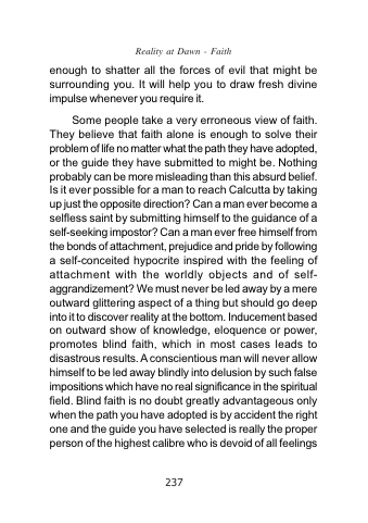 Some people take a very erroneous view of faith. They believe that faith alone is enough to solve their problem of life no matter what the path they have adopted, or the guide they have submitted to might be. Nothing probably can be more misleading than this absurd belief. Is it ever possible for a man to reach Calcutta by taking up just the opposite direction? Can a man ever become a selfless saint by submitting himself to the guidance of a self-seeking impostor? Can a man ever free himself from the bonds of attachment, prejudice and pride by following a self-conceited hypocrite inspired with the feeling of attachment with the worldly objects and of self- aggrandizement? We must never be led away by a mere outward glittering aspect of a thing but should go deep into it to discover reality at the bottom. Inducement based on outward show of knowledge, eloquence or power, promotes blind faith, which in most cases leads to disastrous results. A conscientious man will never allow himself to be led away blindly into delusion by such false impositions which have no real significance in the spiritual field. Blind faith is no doubt greatly advantageous only when the path you have adopted is by accident the right one and the guide you have selected is really the proper person of the highest calibre who is devoid of all feelings