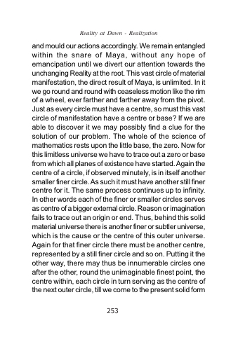 and mould our actions accordingly. We remain entangled within the snare of Maya, without any hope of emancipation until we divert our attention towards the unchanging Reality at the root. This vast circle of material manifestation, the direct result of Maya, is unlimited. In it we go round and round with ceaseless motion like the rim of a wheel, ever farther and farther away from the pivot. Just as every circle must have a centre, so must this vast circle of manifestation have a centre or base? If we are able to discover it we may possibly find a clue for the solution of our problem. The whole of the science of mathematics rests upon the little base, the zero. Now for this limitless universe we have to trace out a zero or base from which all planes of existence have started. Again the centre of a circle, if observed minutely, is in itself another smaller finer circle. As such it must have another still finer centre for it. The same process continues up to infinity. In other words each of the finer or smaller circles serves as centre of a bigger external circle. Reason or imagination fails to trace out an origin or end. Thus, behind this solid material universe there is another finer or subtler universe, which is the cause or the centre of this outer universe. Again for that finer circle there must be another centre, represented by a still finer circle and so on. Putting it the other way, there may thus be innumerable circles one after the other, round the unimaginable finest point, the centre within, each circle in turn serving as the centre of the next outer circle, till we come to the present solid form