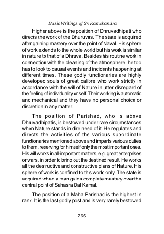 The position of Parishad, who is above Dhruvadhipatis, is bestowed under rare circumstances when Nature stands in dire need of it. He regulates and directs the activities of the various subordinate functionaries mentioned above and imparts various duties to them, reserving for himself only the most important ones. His will works in all-important matters, e.g. great enterprises or wars, in order to bring out the destined result. He works all the destructive and constructive plans of Nature. His sphere of work is confined to this world only. The state is acquired when a man gains complete mastery over the central point of Sahasra Dal Kamal.