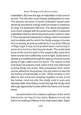 materialism. But now the age of materialism must come to an end. The old order must change yielding place to new. The present structure of world civilization based upon electricity and atomic energy shall not remain in existence for long. It is destined to fall soon. The whole atmosphere is so much charged with the poisonous effect of absolute materialism that it is almost beyond human control to clear it. Time has almost matured for a change which is imminent and inevitable and for which the Godly energy in human form is already at work as referred to in my book Efficacy of Raja Yoga. It may not at present seem convincing to some of us but it is a fact beyond doubt. The world shall know of him and his work in this respect after some time when events have sufficiently come to light. Godly work is always accomplished through the agency of some human being of high calibre and not direct. The reason is that God does not possess mind, which is the only instrument to bring things into action. Man possesses mind, which can be utilized for the purpose, but only when he has lost his feeling of individuality in toto. What remains in him after he has achieved complete negation of self, is not the human mind but only the Godly mind in pure and absolute state. Now Nature works through this Godly mind although apparently it exists within the frame of a human being.