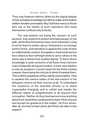 The real wisdom not being the concern of such persons, they pretend to preach and lead people on the path, which they themselves have never traversed. Living is not for them to bother about, forbearance is a foreign word to them, and toleration is against the code of their so-called saintly conduct. Acceptance of personal service from others is their birthright while to serve others in the same way is below their exalted dignity. To them divine knowledge is quite exclusive of all these most common rules of etiquette and good conduct. In their view wisdom is only an academic current meant for the fickle minded masses, theirs being the only job to divert it towards them. This is all the greatness of their saintly personalities. How to awaken the various states of the real wisdom in the abhyasi’s mind is not their concern at all. To understand the mysteries of the Granthis (knots) or to attain Layavastha (merging) and to unfold and master the different states of enlightenment is all beyond their conception. Neither do they themselves know anything about it nor would they condescend to learn it from anyone and accept his guidance in the matter. Yet from whom, after all, are they to learn when all of them are alike in this respect?