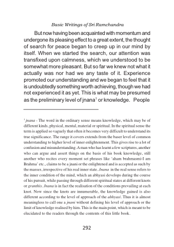 1 jnana - The word in the ordinary sense means knowledge, which may be of different kinds, physical, mental, material or spiritual. In the spiritual sense the term is applied so vaguely that often it becomes very difficult to understand its true significance. The range it covers extends from the baser level of common understanding to higher level of inner enlightenment. This gives rise to a lot of confusion and misunderstanding. A man who has learnt a few scriptures, another who can argue and assert things on the basis of his book knowledge, still another who recites every moment set phrases like ‘aham brahmasmi-I am Brahma’ etc., claims to be a jnani or the enlightened and is accepted as such by the masses, irrespective of his real inner state. Jnana in the real sense refers to the inner condition of the mind, which an abhyasi develops during the course of his pursuit, while passing through different spiritual states at different knots or granthis. Jnana is in fact the realisation of the conditions prevailing at each knot. Now since the knots are innumerable, the knowledge gained is also different according to the level of approach of the abhyasi. Thus it is almost meaningless to call one a jnani without defining his level of approach or the limit of knowledge realised by him. This is the main point, which is meant to be elucidated to the readers through the contents of this little book.
