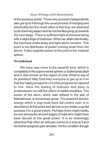 We have now come to the seventh knot, which is completely in the supra-mental sphere or brahmanda desh and is also known as the region of virat. What to say of its grandeur! May God help everyone to get up to it so that the happy prospects of further progress be opened to him. Here the feeling of holiness and piety is predominant, but still the effect of matter breathes. The power of the atom, which was utilised in the war of Mahabharat, is immensely great. The powerful electric energy which a yogi must have full control over, is in abundance at this point and almost every Indian yogi did possess it to a great extent. Perhaps there might hardly be one among the ancient sages of India who might have been devoid of this great power. It is so charmingly attractive that often an abhyasi comes to a stop at it and his further progress gets arrested. Yet the condition though