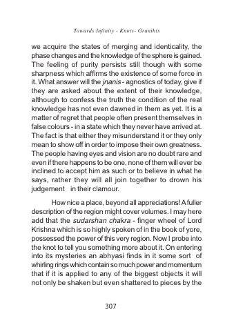 How nice a place, beyond all appreciations! A fuller description of the region might cover volumes. I may here add that the sudarshan chakra - finger wheel of Lord Krishna which is so highly spoken of in the book of yore, possessed the power of this very region. Now I probe into the knot to tell you something more about it. On entering into its mysteries an abhyasi finds in it some sort of whirling rings which contain so much power and momentum that if it is applied to any of the biggest objects it will not only be shaken but even shattered to pieces by the