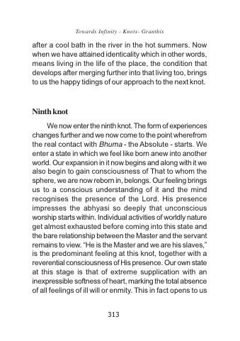 We now enter the ninth knot. The form of experiences changes further and we now come to the point wherefrom the real contact with Bhuma - the Absolute - starts. We enter a state in which we feel like born anew into another world. Our expansion in it now begins and along with it we also begin to gain consciousness of That to whom the sphere, we are now reborn in, belongs. Our feeling brings us to a conscious understanding of it and the mind recognises the presence of the Lord. His presence impresses the abhyasi so deeply that unconscious worship starts within. Individual activities of worldly nature get almost exhausted before coming into this state and the bare relationship between the Master and the servant remains to view. “He is the Master and we are his slaves,” is the predominant feeling at this knot, together with a reverential consciousness of His presence. Our own state at this stage is that of extreme supplication with an inexpressible softness of heart, marking the total absence of all feelings of ill will or enmity. This in fact opens to us