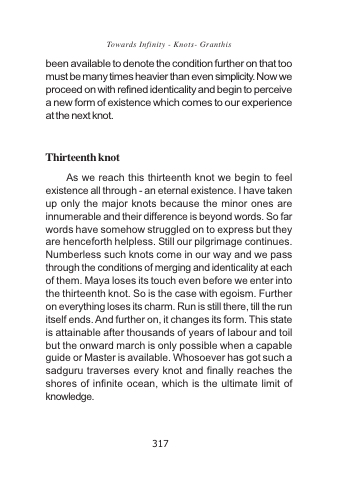 As we reach this thirteenth knot we begin to feel existence all through - an eternal existence. I have taken up only the major knots because the minor ones are innumerable and their difference is beyond words. So far words have somehow struggled on to express but they are henceforth helpless. Still our pilgrimage continues. Numberless such knots come in our way and we pass through the conditions of merging and identicality at each of them. Maya loses its touch even before we enter into the thirteenth knot. So is the case with egoism. Further on everything loses its charm. Run is still there, till the run itself ends. And further on, it changes its form. This state is attainable after thousands of years of labour and toil but the onward march is only possible when a capable guide or Master is available. Whosoever has got such a sadguru traverses every knot and finally reaches the shores of infinite ocean, which is the ultimate limit of knowledge.