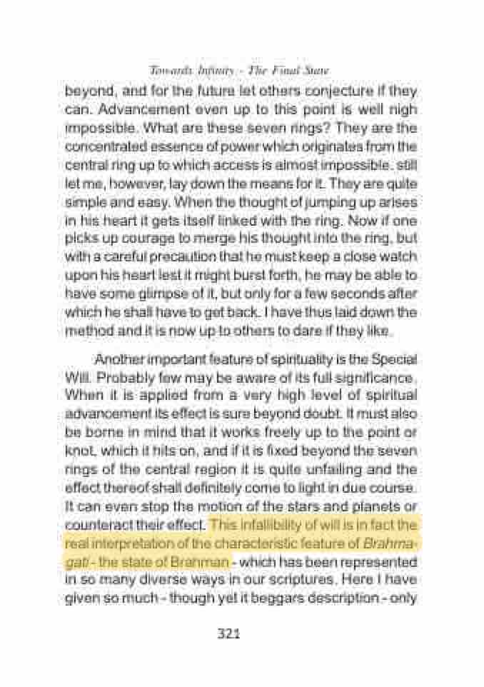 Another important feature of spirituality is the Special Will. Probably few may be aware of its full significance. When it is applied from a very high level of spiritual advancement its effect is sure beyond doubt. It must also be borne in mind that it works freely up to the point or knot, which it hits on, and if it is fixed beyond the seven rings of the central region it is quite unfailing and the effect thereof shall definitely come to light in due course. It can even stop the motion of the stars and planets or counteract their effect. This infallibility of will is in fact the real interpretation of the characteristic feature of Brahma- gati - the state of Brahman - which has been represented in so many diverse ways in our scriptures. Here I have given so much - though yet it beggars description - only