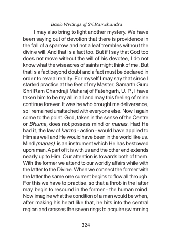 I may also bring to light another mystery. We have been saying out of devotion that there is providence in the fall of a sparrow and not a leaf trembles without the divine will. And that is a fact too. But if I say that God too does not move without the will of his devotee, I do not know what the wiseacres of saints might think of me. But that is a fact beyond doubt and a fact must be declared in order to reveal reality. For myself I may say that since I started practice at the feet of my Master, Samarth Guru Shri Ram Chandraji Maharaj of Fatehgarh, U. P., I have taken him to be my all in all and may this feeling of mine continue forever. It was he who brought me deliverance, so I remained unattached with everyone else. Now I again come to the point. God, taken in the sense of the Centre or Bhuma, does not possess mind or manas. Had He had it, the law of karma - action - would have applied to Him as well and He would have been in the world like us. Mind (manas) is an instrument which He has bestowed upon man. A part of it is with us and the other end extends nearly up to Him. Our attention is towards both of them. With the former we attend to our worldly affairs while with the latter to the Divine. When we connect the former with the latter the same one current begins to flow all through. For this we have to practise, so that a throb in the latter may begin to resound in the former - the human mind. Now imagine what the condition of a man would be when, after making his heart like that, he hits into the central region and crosses the seven rings to acquire swimming