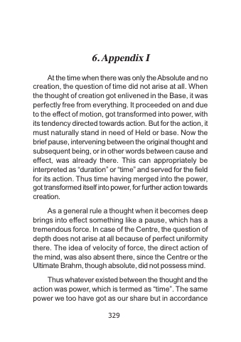 At the time when there was only the Absolute and no creation, the question of time did not arise at all. When the thought of creation got enlivened in the Base, it was perfectly free from everything. It proceeded on and due to the effect of motion, got transformed into power, with its tendency directed towards action. But for the action, it must naturally stand in need of Held or base. Now the brief pause, intervening between the original thought and subsequent being, or in other words between cause and effect, was already there. This can appropriately be interpreted as “duration” or “time” and served for the field for its action. Thus time having merged into the power, got transformed itself into power, for further action towards creation.