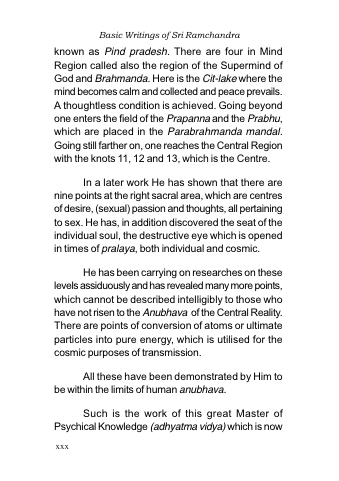 known as Pind pradesh. There are four in Mind Region called also the region of the Supermind of God and Brahmanda. Here is the Cit-lake where the mind becomes calm and collected and peace prevails. A thoughtless condition is achieved. Going beyond one enters the field of the Prapanna and the Prabhu, which are placed in the Parabrahmanda mandal. Going still farther on, one reaches the Central Region with the knots 11, 12 and 13, which is the Centre.