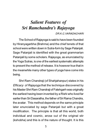 Shri Ram Chandraji (of Shahjahanpur) states in his Efficacy of Rajayoga that the technique discovered by his Master Shri Ram Chandraji of Fatehgarh was originally the earliest having been invented by a Rishi who lived far earlier than Sri Dasaratha, the father of Sri Rama Chandra, the avatar. This method depends on the same principle later enunciated by sage Patanjali but with a great modification. The principle is that all this world, both individual and cosmic, arose out of the original stir (kshobha) and this is of the nature of thought. It is this