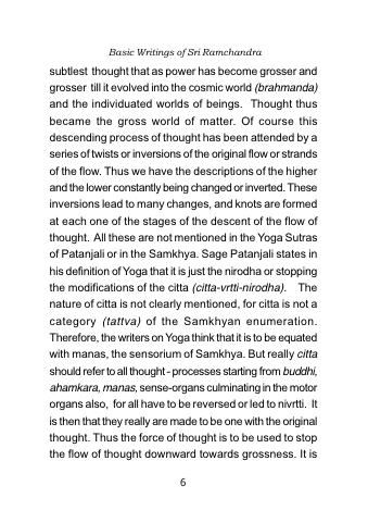 subtlest thought that as power has become grosser and grosser till it evolved into the cosmic world (brahmanda) and the individuated worlds of beings. Thought thus became the gross world of matter. Of course this descending process of thought has been attended by a series of twists or inversions of the original flow or strands of the flow. Thus we have the descriptions of the higher and the lower constantly being changed or inverted. These inversions lead to many changes, and knots are formed at each one of the stages of the descent of the flow of thought. All these are not mentioned in the Yoga Sutras of Patanjali or in the Samkhya. Sage Patanjali states in his definition of Yoga that it is just the nirodha or stopping the modifications of the citta (citta-vrtti-nirodha). The nature of citta is not clearly mentioned, for citta is not a category (tattva) of the Samkhyan enumeration. Therefore, the writers on Yoga think that it is to be equated with manas, the sensorium of Samkhya. But really citta should refer to all thought - processes starting from buddhi, ahamkara, manas, sense-organs culminating in the motor organs also, for all have to be reversed or led to nivrtti. It is then that they really are made to be one with the original thought. Thus the force of thought is to be used to stop the flow of thought downward towards grossness. It is