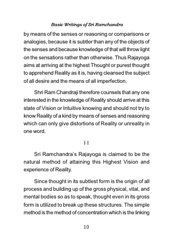 by means of the senses or reasoning or comparisons or analogies, because it is subtler than any of the objects of the senses and because knowledge of that will throw light on the sensations rather than otherwise. Thus Rajayoga aims at arriving at the highest Thought or purest thought to apprehend Reality as it is, having cleansed the subject of all desire and the means of all imperfection.