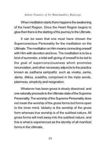It can be seen that one must have chosen the Superconscious Personality for the meditation on the Ultimate. The meditation on Him means connecting oneself with Him with devotion and love. The meditation is to be a kind of surrender, a total self-giving of oneself to be led to the goal of superconsciousness which promotes renunciation, and other necessary adjuncts to the practice known as sadhana sampattis such as viveka, sama, dama, titiksa, sraddha, comprised in the triple words, plainness, simplicity and resignation.