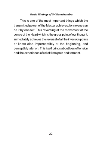 This is one of the most important things which the transmitted power of the Master achieves, for no one can do it by oneself. This reversing of the movement at the centre of the Heart which is the gross point of our thought, immediately achieves the reversal of all the inversion points or knots also imperceptibly at the beginning, and perceptibly later on. This itself brings about loss of tension and the experience of relief from pain and torment.