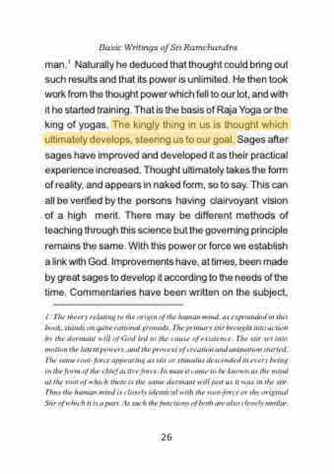 man.1 Naturallyhededucedthatthoughtcouldbringout such results and that its power is unlimited. He then took work from the thought power which fell to our lot, and with it he started training. That is the basis of Raja Yoga or the king of yogas. The kingly thing in us is thought which ultimately develops, steering us to our goal. Sages after sages have improved and developed it as their practical experience increased. Thought ultimately takes the form of reality, and appears in naked form, so to say. This can all be verified by the persons having clairvoyant vision of a high merit. There may be different methods of teaching through this science but the governing principle remains the same. With this power or force we establish a link with God. Improvements have, at times, been made by great sages to develop it according to the needs of the time. Commentaries have been written on the subject,