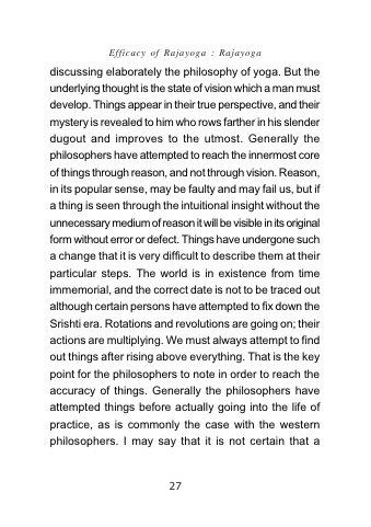 discussing elaborately the philosophy of yoga. But the underlying thought is the state of vision which a man must develop. Things appear in their true perspective, and their mystery is revealed to him who rows farther in his slender dugout and improves to the utmost. Generally the philosophers have attempted to reach the innermost core of things through reason, and not through vision. Reason, in its popular sense, may be faulty and may fail us, but if a thing is seen through the intuitional insight without the unnecessary medium of reason it will be visible in its original form without error or defect. Things have undergone such a change that it is very difficult to describe them at their particular steps. The world is in existence from time immemorial, and the correct date is not to be traced out although certain persons have attempted to fix down the Srishti era. Rotations and revolutions are going on; their actions are multiplying. We must always attempt to find out things after rising above everything. That is the key point for the philosophers to note in order to reach the accuracy of things. Generally the philosophers have attempted things before actually going into the life of practice, as is commonly the case with the western philosophers. I may say that it is not certain that a