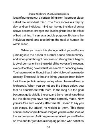 When you reach this stage, you find yourself soon jumping into the ocean of eternal peace and sublimity, and when your thought becomes so strong that it begins to dwell permanently in the midst of the waves of the ocean, every other thing downward then seems to be fading away. You have no other thought but that which you have made already. The result is that the things you see down below look like objects in a deep valley when observed from a high peak. When you do not see the things below, you feel no attachment with them. In the long run the goal becomes quite vivid to the eye, and there remains nothing but the object you have really and correctly made. Now you are free from worldly attachments. I mean to say you see things, but attach no weight to them. This thing continues for some time as long as you have the idea of the same nature. As time goes on you feel yourself to be as free and forgetful as a sleeping person who satisfies