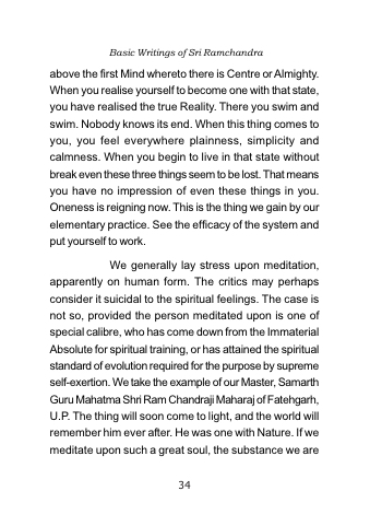 We generally lay stress upon meditation, apparently on human form. The critics may perhaps consider it suicidal to the spiritual feelings. The case is not so, provided the person meditated upon is one of special calibre, who has come down from the Immaterial Absolute for spiritual training, or has attained the spiritual standard of evolution required for the purpose by supreme self-exertion. We take the example of our Master, Samarth Guru Mahatma Shri Ram Chandraji Maharaj of Fatehgarh, U.P. The thing will soon come to light, and the world will remember him ever after. He was one with Nature. If we meditate upon such a great soul, the substance we are