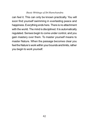 can feel it. This can only be known practically. You will soon find yourself swimming in everlasting peace and happiness. Everything ends here. There is no attachment with the world. The mind is disciplined. It is automatically regulated. Senses begin to come under control, and you gain mastery over them. To master yourself means to master Nature. When the passage becomes clear you feel the Nature’s work within your bounds and limits, rather you begin to work yourself.