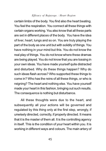 All these thoughts were due to the heart, and subsequently all your actions will be governed and regulated by this thing only at the first step, wrongly, if unwisely directed, correctly, if properly directed. It means that it is the master of them all. It is the controlling agency in itself. This is the condition of your heart within you. It is working in different ways and colours. The main artery of