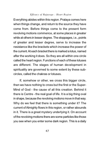 Everything abides within this region. Pralaya comes here when things change, and return to the source they have come from. Before things come to the present form revolving motions commence, at some places in greater while at others in lesser degree. The stoppages, i.e., points of greater and lesser degree, serve to increase the resistance like the brackets which increase the power of the current. At each bracket there is marked a lotus, named after the working it does. So they are all within one circle called the heart region. Functions of each of these lotuses are different. The stages of human development in spirituality are governed to some extent by these sub- circles, called the chakras or lotuses.