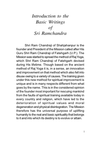 Shri Ram Chandraji of Shahjahanpur is the founder and President of the Mission called after His Guru Shri Ram Chandraji of Fatehgarh (U.P.). The Mission was started to spread the method of Raj Yoga, which Shri Ram Chandraji of Fatehgarh devised during His lifetime. Though based on the ancient method of Raj Yoga it is, in a sense, an innovation and improvement on that method which also fell into disuse owing to a variety of causes. The training given under this new method for spiritual improvement is unique and is in many respects different from what goes by the name. This is in the considered opinion of the founder most important for rescuing mankind from the faults of spiritual training available today in every country and religion, which have led to the deterioration of spiritual values and moral degeneration and physical disintegration. The Mission therefore has the universal purpose of uplifting humanity to the real and basic spirituality that belongs to it and into which its destiny is to evolve or attain.