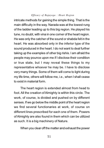 The heart region is extended almost from head to foot. All the creation of Almighty is within this circle. The work, of course, is divided and pushed on by different senses. If we go below the middle point of the heart region we find several functionaries at work, of course on different lines prescribed for each one of them. Powers of Almighty are also found in them which can be utilized as such. It is a big machinery of Nature.