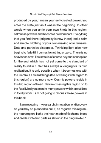 produced by you, I mean your self-created power, you enter the state just as it was in the beginning. In other words when you untie your own knots in this region, calmness prevails and becomes predominant. Everything that you find there (originality is now there) looks calm and simple. Nothing of your own making now remains. Dots and particles disappear. Twinkling light also now begins to fade till it comes to nothing or zero. There is no heaviness now. The state is of course beyond conception for the soul which has not yet come to the standard of reality found in it. Self has always a longing for its own realisation. It is only possible when it becomes one with the Centre. Outward things (the coverings with regard to this region) are no more now. Cosmic powers reside in this big region of heart. Before crossing this region on to the Real Mind you acquire many powers which are utilized in Godly work. I am not going to discuss these powers in this book.