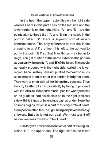 In the heart the upper region lies on the right side whereas here in this part it lies on the left side and the lower region is on the right. Here, ‘A1’ and ‘B1’’ are the points akin to those (i.e., ‘A’ and ‘B’) in the heart. In the portion called ‘D1’ there is superior sort of super- consciousness. The only difference is that the ideas creeping in at ‘A1’ are finer. It is left to the abhyasi to purify the point ‘B1’ so that finer things may begin to reign. You get purified to the same extent in this portion as you purify the points ‘A’ and ‘B’ of the heart. The people generally proceed with the right side, called the lower region, because they have not purified the heart so much as to enable them to enter this portion in brighter state. They want to enter with all the things they possess. Thus they try to attempt an impossibility by trying to proceed with the left side. It depends much upon the worthy master or the guide to lead his disciple on to the right (correct) side with his things or belongings cast as under. Here the cosmos begins, which is a part of this big circle of heart. Here people often feel the light being displayed in heavy showers. But this is not our goal. We must tear it off before we cross this big circle of heart.