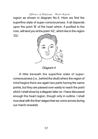 A little beneath the superfine state of super- consciousness (i.e., behind the skull) where the region of mind begins there are again two parts having the same points, but they are passed over easily to reach the point which I shall show by a diagram later on. I have discussed enough the heart region, though only in outline. I shall now deal with the finer stages that we come across during our march onwards.