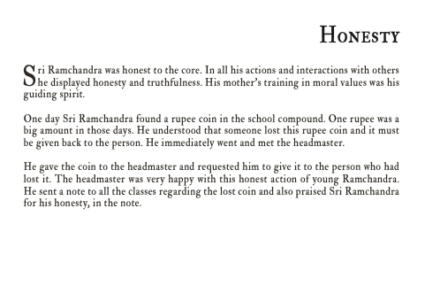 He gave the coin to the headmaster and requested him to give it to the person who had lost it. The headmaster was very happy with this honest action of young Ramchandra. He sent a note to all the classes regarding the lost coin and also praised Sri Ramchandra for his honesty, in the note.