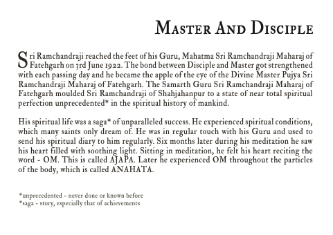 Sri Ramchandraji reached the feet of his Guru, Mahatma Sri Ramchandraji Maharaj of Fatehgarh on 3rd June 1922. The bond between Disciple and Master got strengthened with each passing day and he became the apple of the eye of the Divine Master Pujya Sri