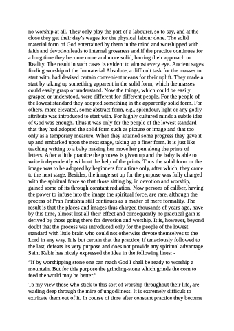 no worship at all. They only play the part of a labourer, so to say, and at the close they get their day’s wages for the physical labour done. The solid material form of God entertained by them in the mind and worshipped with faith and devotion leads to internal grossness and if the practice continues for a long time they become more and more solid, barring their approach to Reality. The result in such cases is evident to almost every eye. Ancient sages finding worship of the Immaterial Absolute, a difficult task for the masses to start with, had devised certain convenient means for their uplift. They made a start by taking up something apparent in the solid form, which the masses could easily grasp or understand. Now the things, which could be easily grasped or understood, were different for different people. For the people of the lowest standard they adopted something in the apparently solid form. For others, more elevated, some abstract form, e.g., splendour, light or any godly attribute was introduced to start with. For highly cultured minds a subtle idea of God was enough. Thus it was only for the people of the lowest standard that they had adopted the solid form such as picture or image and that too only as a temporary measure. When they attained some progress they gave it up and embarked upon the next stage, taking up a finer form. It is just like teaching writing to a baby making her move her pen along the prints of letters. After a little practice the process is given up and the baby is able to write independently without the help of the prints. Thus the solid form or the image was to be adopted by beginners for a time only, after which, they came to the next stage. Besides, the image set up for the purpose was fully charged with the spiritual force so that those sitting by, in devotion and worship, gained some of its through constant radiation. Now persons of caliber, having the power to infuse into the image the spiritual force, are rare, although the process of Pran Pratishta still continues as a matter of mere formality. The result is that the places and images thus charged thousands of years ago, have by this time, almost lost all their effect and consequently no practical gain is derived by those going there for devotion and worship. It is, however, beyond doubt that the process was introduced only for the people of the lowest standard with little brain who could not otherwise devote themselves to the Lord in any way. It is but certain that the practice, if tenaciously followed to the last, defeats its very purpose and does not provide any spiritual advantage. Saint Kabir has nicely expressed the idea in the following lines: -