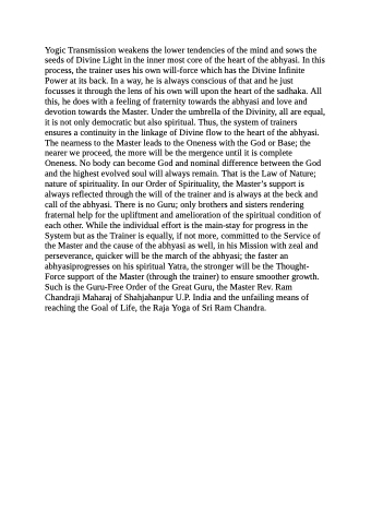 Yogic Transmission weakens the lower tendencies of the mind and sows the seeds of Divine Light in the inner most core of the heart of the abhyasi. In this process, the trainer uses his own will-force which has the Divine Infinite Power at its back. In a way, he is always conscious of that and he just focusses it through the lens of his own will upon the heart of the sadhaka. All this, he does with a feeling of fraternity towards the abhyasi and love and devotion towards the Master. Under the umbrella of the Divinity, all are equal, it is not only democratic but also spiritual. Thus, the system of trainers ensures a continuity in the linkage of Divine flow to the heart of the abhyasi. The nearness to the Master leads to the Oneness with the God or Base; the nearer we proceed, the more will be the mergence until it is complete Oneness. No body can become God and nominal difference between the God and the highest evolved soul will always remain. That is the Law of Nature; nature of spirituality. In our Order of Spirituality, the Master’s support is always reflected through the will of the trainer and is always at the beck and call of the abhyasi. There is no Guru; only brothers and sisters rendering fraternal help for the upliftment and amelioration of the spiritual condition of each other. While the individual effort is the main-stay for progress in the System but as the Trainer is equally, if not more, committed to the Service of the Master and the cause of the abhyasi as well, in his Mission with zeal and perseverance, quicker will be the march of the abhyasi; the faster an abhyasiprogresses on his spiritual Yatra, the stronger will be the Thought- Force support of the Master (through the trainer) to ensure smoother growth. Such is the Guru-Free Order of the Great Guru, the Master Rev. Ram Chandraji Maharaj of Shahjahanpur U.P. India and the unfailing means of reaching the Goal of Life, the Raja Yoga of Sri Ram Chandra.