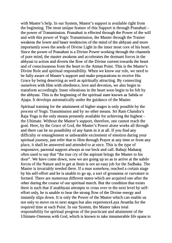 Spiritual training for the attainment of higher stages is only possible by the process of Yogic Transmission and by no other means. Sri Ram Chandra’s Raja Yoga is the only means presently available for achieving the highest - the Ultimate. Without the Master’s support, therefore, one cannot reach the goal. Here, by the Grace of God, the Master’s Power alone works all through and there can be no possibility of any harm in it at all. If you find any difficulty or entanglement or unbearable excitement of emotion during your spiritual journey, just refer that to Him through Prayer at any time or from any place, it shall be answered and attended to at once. This is the type of responsive, parental support always at our beck and call. Babuji Maharaj often used to say that “the true cry of the aspirant brings the Master to his door”. We have come down, now we are going up so as to arrive at the subtle forces of the Nature and to get at them is not an easy job for the Sadhaka. The Master is invariably needed there. If a man somehow, reached a certain stage by his self-effort and he is unable to go up, a sort of grossness or curvature is formed. There are numerous different states which are acquired one after the other during the course of our spiritual march. But the condition that exists there is such that if anabhyasi attempts to cross over to the next level by self- effort only, he is unable to bear the strong flow of the Divine energy and instantly slips down. It is only the Power of the Master which can enable us not only to move on to next stages but also experienceLaya Avastha for the required time at each Point. In our System, the Master takes total responsibility for spiritual progress of the practicant and attainment of the Ultimate-Oneness with God, which is known to take innumerable life spans to