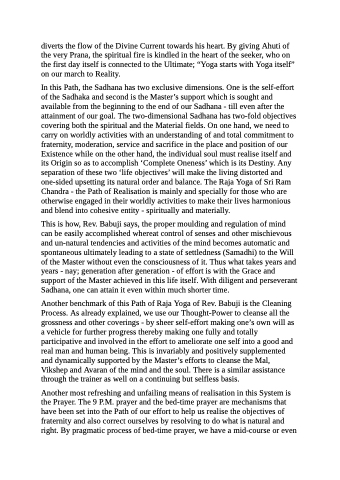 In this Path, the Sadhana has two exclusive dimensions. One is the self-effort of the Sadhaka and second is the Master’s support which is sought and available from the beginning to the end of our Sadhana - till even after the attainment of our goal. The two-dimensional Sadhana has two-fold objectives covering both the spiritual and the Material fields. On one hand, we need to carry on worldly activities with an understanding of and total commitment to fraternity, moderation, service and sacrifice in the place and position of our Existence while on the other hand, the individual soul must realise itself and its Origin so as to accomplish ‘Complete Oneness’ which is its Destiny. Any separation of these two ‘life objectives’ will make the living distorted and one-sided upsetting its natural order and balance. The Raja Yoga of Sri Ram Chandra - the Path of Realisation is mainly and specially for those who are otherwise engaged in their worldly activities to make their lives harmonious and blend into cohesive entity - spiritually and materially.