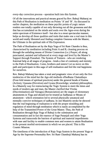 The Path of Realisation set by the Raja Yoga of Sri Ram Chandra is thus, characterised by meditation including Point A and B, cleaning process on through the unfailing means of Divine Connection (i.e.) Prayer; all along punctuated, assisted and influenced at every stage and level by the Master’s Support through Pranahuti. The System of Trainers - who are rendering fraternal help at all stages of progress - lends a line of continuity and eternity to the Path of Realisation. Come, brothers and sisters! Let us move on this path and participate in this saga of self-realisation and feel the real happiness for ourselves.