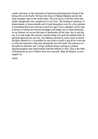 cosmic relevance to the restoration of spiritual and harmonious living of the human life on the Earth. We have the Grace of Babuji Maharaj and are the most fortunate ones in the world today. This one factor of Divine Grace has totally changed the very complexion of our lives. The feeling of calmness, of balancedness, of pious attitude and of total absorption even for a few minutes is something that every saint has craved for ages. Even a glimpse of this state is known to release us from the bondages and enable one to attain liberation. In our System, we secure this state of spirituality all the time, day in and day out. It is only under this system a human being can reach the farthest limit of spiritual approach for any one. Our Masters secured It; some of the reverend disciples attained it; it is possible for any body to reach it and all are welcome to seek and experience this state during this very life itself. The practices on this path are dynamic and ‘Living’ methods always aiming at constant spiritual progress and improvement with the Infinite in view. This is the Path of Realisation we are to follow from now onwards. May the Master, as ever, support us.