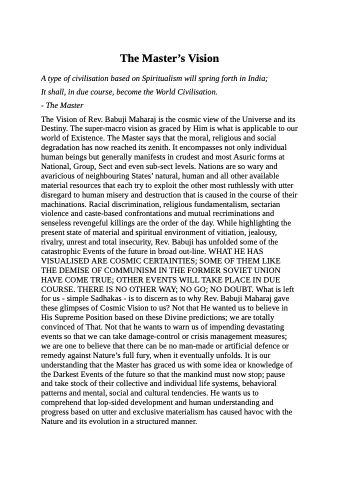 The Vision of Rev. Babuji Maharaj is the cosmic view of the Universe and its Destiny. The super-macro vision as graced by Him is what is applicable to our world of Existence. The Master says that the moral, religious and social degradation has now reached its zenith. It encompasses not only individual human beings but generally manifests in crudest and most Asuric forms at National, Group, Sect and even sub-sect levels. Nations are so wary and avaricious of neighbouring States’ natural, human and all other available material resources that each try to exploit the other most ruthlessly with utter disregard to human misery and destruction that is caused in the course of their machinations. Racial discrimination, religious fundamentalism, sectarian violence and caste-based confrontations and mutual recriminations and senseless revengeful killings are the order of the day. While highlighting the present state of material and spiritual environment of vitiation, jealousy, rivalry, unrest and total insecurity, Rev. Babuji has unfolded some of the catastrophic Events of the future in broad out-line. WHAT HE HAS VISUALISED ARE COSMIC CERTAINTIES; SOME OF THEM LIKE THE DEMISE OF COMMUNISM IN THE FORMER SOVIET UNION HAVE COME TRUE; OTHER EVENTS WILL TAKE PLACE IN DUE COURSE. THERE IS NO OTHER WAY; NO GO; NO DOUBT. What is left for us - simple Sadhakas - is to discern as to why Rev. Babuji Maharaj gave these glimpses of Cosmic Vision to us? Not that He wanted us to believe in His Supreme Position based on these Divine predictions; we are totally convinced of That. Not that he wants to warn us of impending devastating events so that we can take damage-control or crisis management measures; we are one to believe that there can be no man-made or artificial defence or remedy against Nature’s full fury, when it eventually unfolds. It is our understanding that the Master has graced us with some idea or knowledge of the Darkest Events of the future so that the mankind must now stop; pause and take stock of their collective and individual life systems, behavioral patterns and mental, social and cultural tendencies. He wants us to comprehend that lop-sided development and human understanding and progress based on utter and exclusive materialism has caused havoc with the Nature and its evolution in a structured manner.