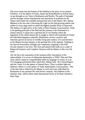 Om Tat Sat is the expression of the inexpres-sible; description of the indescribable. It is a way of telling that Spirituality is THAT, That and That alone which cannot be comprehended either by language or senses. It is an Un-Changing and Eternal State which Rev. Babuji calls - the Central Region and the Centre. It is the sphere of Eternal Peace. There is neither light nor darkness. Below it, is the sphere of Truth, Ramchandra Consciousness’. This is the state that is offered by the Master to each and every individual for Realisation in his spiritual life with Divine certainty. The Emblem of the Institute, thus, reflects these multi-dimensional facets of Sri Ram Chandra’s Raja Yoga.