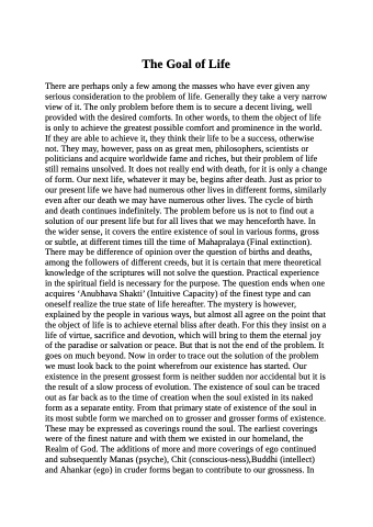 There are perhaps only a few among the masses who have ever given any serious consideration to the problem of life. Generally they take a very narrow view of it. The only problem before them is to secure a decent living, well provided with the desired comforts. In other words, to them the object of life is only to achieve the greatest possible comfort and prominence in the world. If they are able to achieve it, they think their life to be a success, otherwise not. They may, however, pass on as great men, philosophers, scientists or politicians and acquire worldwide fame and riches, but their problem of life still remains unsolved. It does not really end with death, for it is only a change of form. Our next life, whatever it may be, begins after death. Just as prior to our present life we have had numerous other lives in different forms, similarly even after our death we may have numerous other lives. The cycle of birth and death continues indefinitely. The problem before us is not to find out a solution of our present life but for all lives that we may henceforth have. In the wider sense, it covers the entire existence of soul in various forms, gross or subtle, at different times till the time of Mahapralaya (Final extinction). There may be difference of opinion over the question of births and deaths, among the followers of different creeds, but it is certain that mere theoretical knowledge of the scriptures will not solve the question. Practical experience in the spiritual field is necessary for the purpose. The question ends when one acquires ‘Anubhava Shakti’ (Intuitive Capacity) of the finest type and can oneself realize the true state of life hereafter. The mystery is however, explained by the people in various ways, but almost all agree on the point that the object of life is to achieve eternal bliss after death. For this they insist on a life of virtue, sacrifice and devotion, which will bring to them the eternal joy of the paradise or salvation or peace. But that is not the end of the problem. It goes on much beyond. Now in order to trace out the solution of the problem we must look back to the point wherefrom our existence has started. Our existence in the present grossest form is neither sudden nor accidental but it is the result of a slow process of evolution. The existence of soul can be traced out as far back as to the time of creation when the soul existed in its naked form as a separate entity. From that primary state of existence of the soul in its most subtle form we marched on to grosser and grosser forms of existence. These may be expressed as coverings round the soul. The earliest coverings were of the finest nature and with them we existed in our homeland, the Realm of God. The additions of more and more coverings of ego continued and subsequently Manas (psyche), Chit (conscious-ness),Buddhi (intellect) and Ahankar (ego) in cruder forms began to contribute to our grossness. In