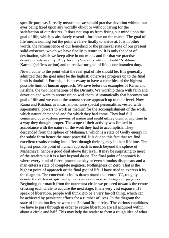 specific purpose. It really means that we should practise devotion without our eyes being fixed upon any worldly object or without caring for the satisfaction of our desires. It does not stop us from fixing our mind upon the goal of life, which is absolutely essential for those on the march. The goal of life means nothing but the point we have finally to arrive at. It is in other words, the reminiscence of our homeland or the primeval state of our present solid existence, which we have finally to return to. It is only the idea of destination, which we keep alive in our minds and for that we practise devotion only as duty. Duty for duty’s sake is without doubt ‘Nishkam Karma’ (selfless action) and to realize our goal of life is our bounden duty.
