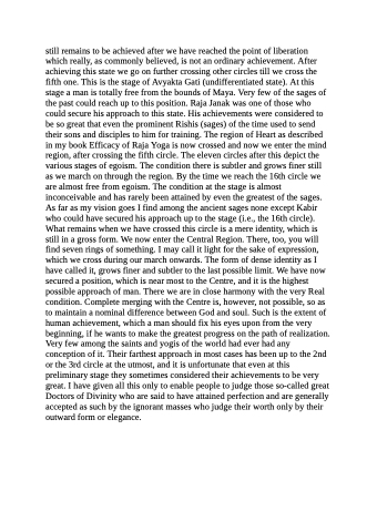 still remains to be achieved after we have reached the point of liberation which really, as commonly believed, is not an ordinary achievement. After achieving this state we go on further crossing other circles till we cross the fifth one. This is the stage of Avyakta Gati (undifferentiated state). At this stage a man is totally free from the bounds of Maya. Very few of the sages of the past could reach up to this position. Raja Janak was one of those who could secure his approach to this state. His achievements were considered to be so great that even the prominent Rishis (sages) of the time used to send their sons and disciples to him for training. The region of Heart as described in my book Efficacy of Raja Yoga is now crossed and now we enter the mind region, after crossing the fifth circle. The eleven circles after this depict the various stages of egoism. The condition there is subtler and grows finer still as we march on through the region. By the time we reach the 16th circle we are almost free from egoism. The condition at the stage is almost inconceivable and has rarely been attained by even the greatest of the sages. As far as my vision goes I find among the ancient sages none except Kabir who could have secured his approach up to the stage (i.e., the 16th circle). What remains when we have crossed this circle is a mere identity, which is still in a gross form. We now enter the Central Region. There, too, you will find seven rings of something. I may call it light for the sake of expression, which we cross during our march onwards. The form of dense identity as I have called it, grows finer and subtler to the last possible limit. We have now secured a position, which is near most to the Centre, and it is the highest possible approach of man. There we are in close harmony with the very Real condition. Complete merging with the Centre is, however, not possible, so as to maintain a nominal difference between God and soul. Such is the extent of human achievement, which a man should fix his eyes upon from the very beginning, if he wants to make the greatest progress on the path of realization. Very few among the saints and yogis of the world had ever had any conception of it. Their farthest approach in most cases has been up to the 2nd or the 3rd circle at the utmost, and it is unfortunate that even at this preliminary stage they sometimes considered their achievements to be very great. I have given all this only to enable people to judge those so-called great Doctors of Divinity who are said to have attained perfection and are generally accepted as such by the ignorant masses who judge their worth only by their outward form or elegance.
