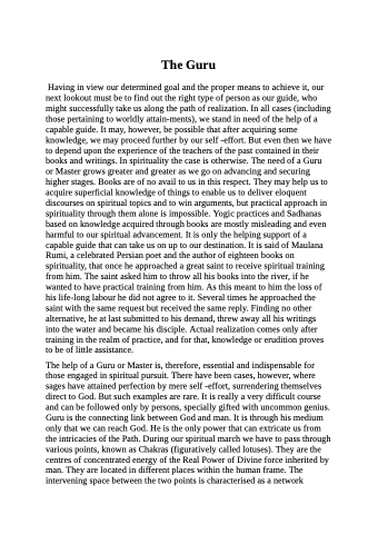 Having in view our determined goal and the proper means to achieve it, our next lookout must be to find out the right type of person as our guide, who might successfully take us along the path of realization. In all cases (including those pertaining to worldly attain-ments), we stand in need of the help of a capable guide. It may, however, be possible that after acquiring some knowledge, we may proceed further by our self -effort. But even then we have to depend upon the experience of the teachers of the past contained in their books and writings. In spirituality the case is otherwise. The need of a Guru or Master grows greater and greater as we go on advancing and securing higher stages. Books are of no avail to us in this respect. They may help us to acquire superficial knowledge of things to enable us to deliver eloquent discourses on spiritual topics and to win arguments, but practical approach in spirituality through them alone is impossible. Yogic practices and Sadhanas based on knowledge acquired through books are mostly misleading and even harmful to our spiritual advancement. It is only the helping support of a capable guide that can take us on up to our destination. It is said of Maulana Rumi, a celebrated Persian poet and the author of eighteen books on spirituality, that once he approached a great saint to receive spiritual training from him. The saint asked him to throw all his books into the river, if he wanted to have practical training from him. As this meant to him the loss of his life-long labour he did not agree to it. Several times he approached the saint with the same request but received the same reply. Finding no other alternative, he at last submitted to his demand, threw away all his writings into the water and became his disciple. Actual realization comes only after training in the realm of practice, and for that, knowledge or erudition proves to be of little assistance.