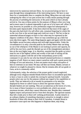 interwoven by numerous intricate fibres. As we proceed along we have to pass through these entanglements of the intervening layers. We have to stay there for a considerable time to complete the Bhog. Bhog does not only mean undergoing the effect of our past actions but it really means passing through the process of unfolding the intricacies of the point which we have already arrived at. Our stay at these points for the purpose of Bhog is often very long and in most cases it is almost impossible to get out of it by mere self -effort. It may, however, be possible at a few preliminary stages but subsequently it becomes quite impracticable. It has been observed that most of the sages of the past who had tried it by self-effort only, remained lingering for whole life on the very first or the second stage and could not cross it. The fact is that at somewhat advanced stages we have to face what may be expressed as the slippery condition of the place. There we may sometimes go up a little but soon slip down again. The same thing happens again and again with the result that higher ascent becomes arduous and well-nigh impracticable. Under the circumstances it is only a forceful push by the worthy Master that can bring us out of the whirlpool. If the Master is not lacking in power and capacity, he will by his own force, push the disciple up out of the entanglement and place him on the next higher stage. It is, therefore, essential that the guide we select must be one of the highest calibre and worthy of the task of tearing off the intricacies at a glance with the aid of the extraordinary power at his command. It can only be one who has himself attained perfection or complete negation of self. Hence we must connect ourselves with such a great power by feelings of love and attraction. It does not matter much what conception of him we entertain in our mind. We may call him our friend, Master, servant or whatever we might be pleased to choose. But he remains after all our guide or Guru, as he is commonly called.
