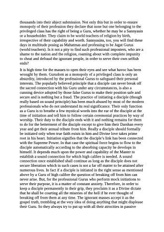 thousands into their abject submission. Not only this but in order to ensure monopoly of their profession they declare that none but one belonging to the privileged class has the right of being a Guru, whether he may be a Sannyasin or a householder. They claim to be world teachers of religion by birth, irrespective of their capability and worth. Sannyasins, too, you will find these days in multitude posing as Mahatmas and professing to be Jagat Gurus (world teachers). Is it not a pity to find such professional imposters, who are a shame to the nation and the religion, roaming about with complete impunity to cheat and defraud the ignorant people, in order to serve their own selfish ends?
