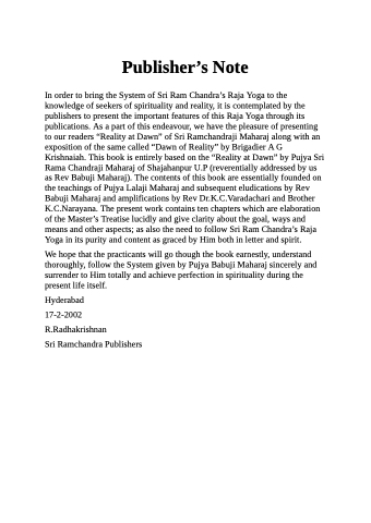 In order to bring the System of Sri Ram Chandra’s Raja Yoga to the knowledge of seekers of spirituality and reality, it is contemplated by the publishers to present the important features of this Raja Yoga through its publications. As a part of this endeavour, we have the pleasure of presenting to our readers “Reality at Dawn” of Sri Ramchandraji Maharaj along with an exposition of the same called “Dawn of Reality” by Brigadier A G Krishnaiah. This book is entirely based on the “Reality at Dawn” by Pujya Sri Rama Chandraji Maharaj of Shajahanpur U.P (reverentially addressed by us as Rev Babuji Maharaj). The contents of this book are essentially founded on the teachings of Pujya Lalaji Maharaj and subsequent eludications by Rev Babuji Maharaj and amplifications by Rev Dr.K.C.Varadachari and Brother K.C.Narayana. The present work contains ten chapters which are elaboration of the Master’s Treatise lucidly and give clarity about the goal, ways and means and other aspects; as also the need to follow Sri Ram Chandra’s Raja Yoga in its purity and content as graced by Him both in letter and spirit.