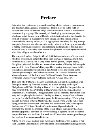 This book titled ‘Dawn of Reality’ is essentially a detailed elucidation of all the topics written by the Great Master, Sri Ram Chandraji Maharaj of Shahjahanpur (U.P) in ‘Reality at Dawn’. It is thoughtful of the publisher to have presented the book “Reality at Dawn” along with this exposition by Brigadier A G Krishnaiah. Though Revered Babuji Maharaj, has written in an easy and simple style the book of ‘Reality At Dawn’, many of the sadhakas barring a few, did find it difficult to grasp the hidden meanings. While going through the works of Great Master one has to go beyond words, rather than trying to understand between the words and between the lines. Sensing this, the Institute of Sri Ram Chandra Consciousness, Hyderabad which is committed to spread the message of the Great Master in its purity has been generating spiritual literature on Revered Babuji’s System. In fact the author has put his heart and soul into this work would be evident as one goes through this book with seriousness and interest.